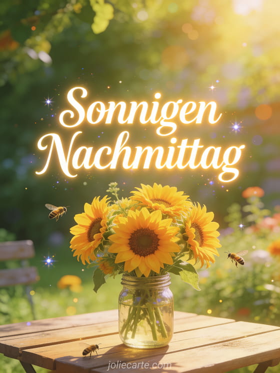 Teile Sommerfreude mit dieser sonnigen Nachmittagskarte mit einem fröhlichen Sonnenblumenstrauß im Einmachglas mit summenden Bienen. Entdecke auch eine Karte von guten nachmittag sonnenschein oder sehr schöne bilder guten nachmittag.