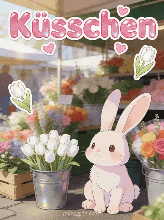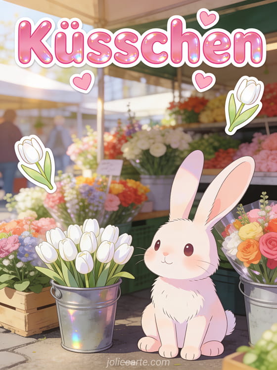 Teile süße Küsschen mit dieser charmanten Frühlingskarte mit einem Häschen auf einem Blumenmarkt. Entdecke auch eine schöne karte küsschen oder gif fisch küsschen für mehr zärtliche Küsschengrüße.