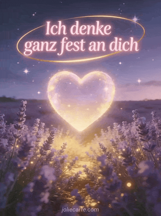 GIF Ich denke fest an dich ein märchenhaftes GIF mit einem strahlenden Herz über Lavendel