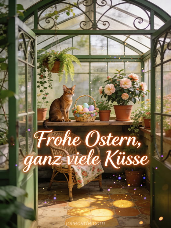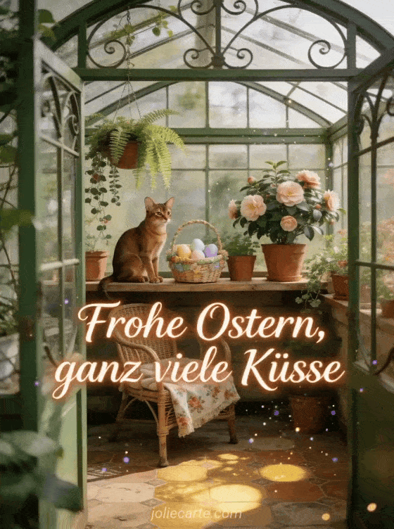 Teile dieses zarte GIF mit Osterküssen mit einer entzückenden Abyssinierkatze und Frühlingskamelien. Entdecke auch Frohe Ostern Bild oder Oster GIF kostenlos.