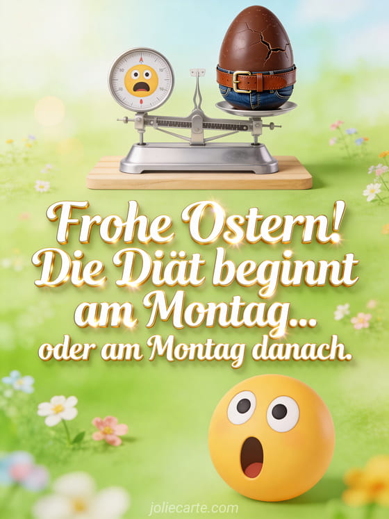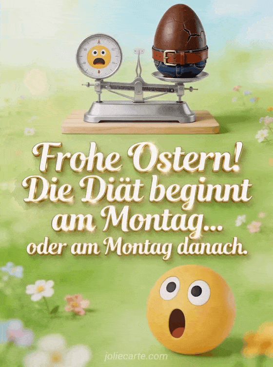 Senden Sie ein lustiges Oster-GIF mit einem Schokoladenei, das nicht mehr in seinen Gürtel passt. Die Diät beginnt am Montag... oder am Montag danach. Entdecken Sie auch eine humorvolle Osterkarte oder ein lustiges Osterbild und eine Karte für ein schönes Osterwochenende.