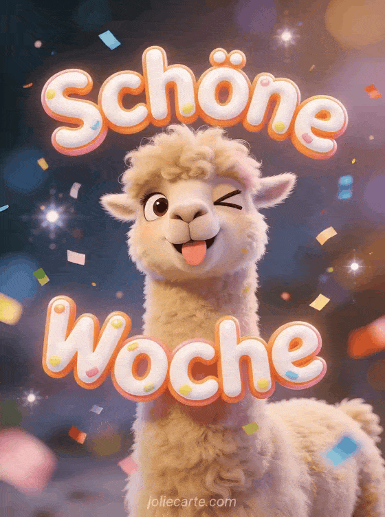Sende ein lustiges Gif fĂŒr eine schöne Woche und lass jemanden lĂ€cheln. Ein witziges Lama mit Konfetti bringt den perfekten Humor-Moment. Entdecke auch eine Karte schöne woche schönen tag oder ein Bild humor schöne woche.