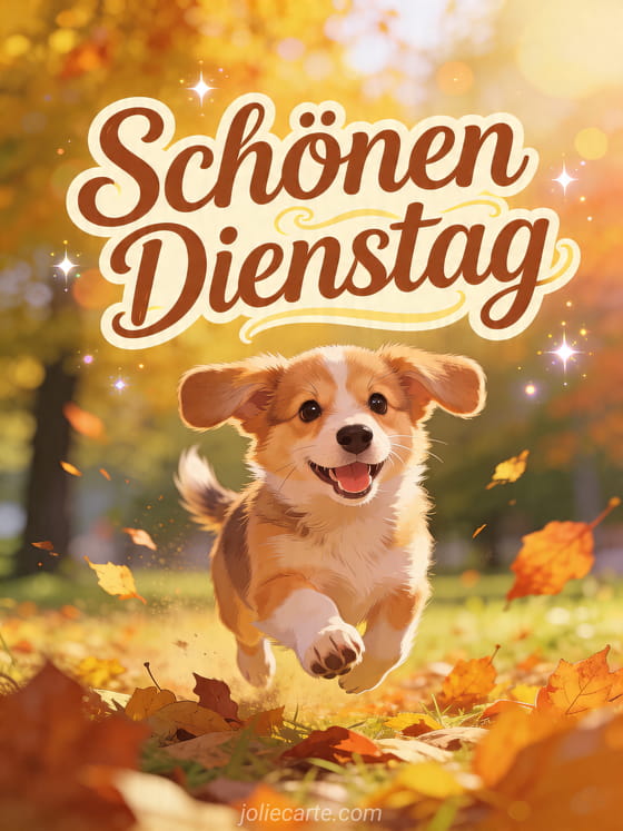 schönen dienstag ein verspielter dienstagsgruß voller herbstblätter und welpenenergie