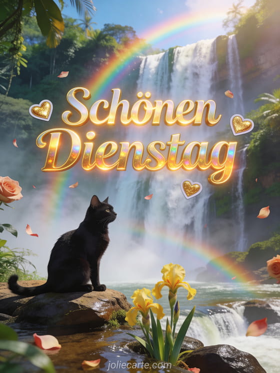 Überrasche jemanden mit dieser spektakulären Dienstag-Karte mit den Iguazú-Wasserfällen und einer eleganten schwarzen Katze. Entdecke auch schöner Dienstag Küsschen oder Foto schönen Tag Dienstag.