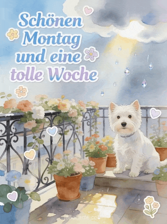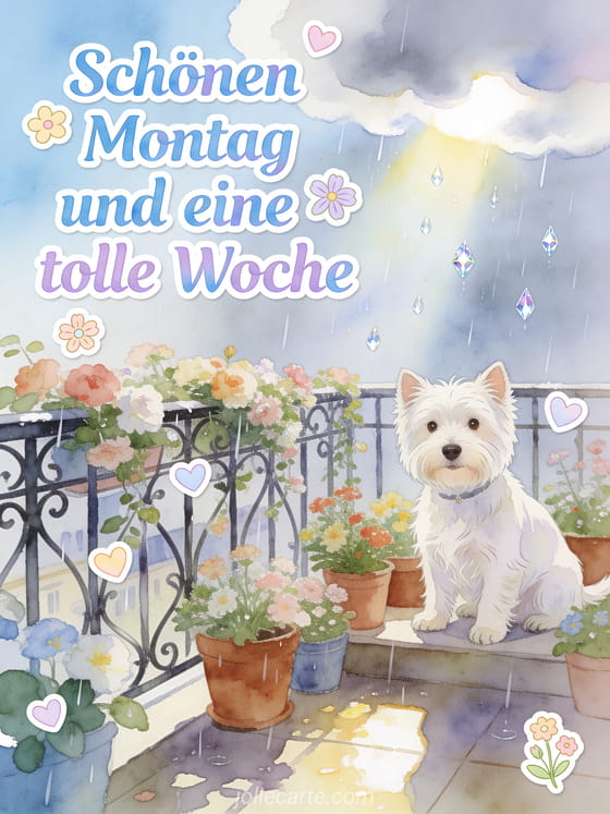 Starte die Woche mit dieser charmanten Montag-Karte mit einem entzückenden weißen Westie auf einem Blumenbalkon mit Regen und Sonne. Entdecke auch humorvoll guter Montag und gute Woche Humor oder schönen Montag GIF lustig.