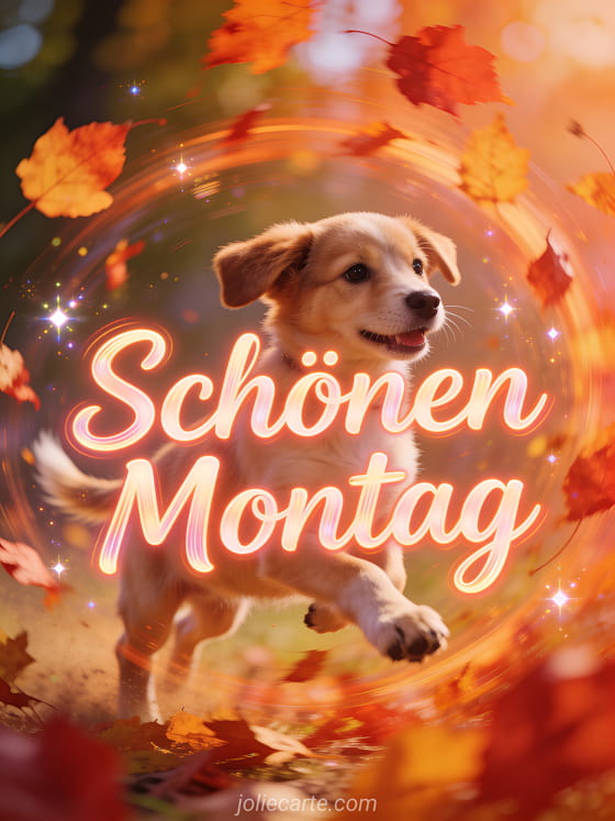 Starten Sie die Woche mit einem Lächeln und versenden Sie diese entzückende Karte für einen schönen Montag. Ein süßer Welpe rennt fröhlich durch buntes Herbstlaub voller Energie. Entdecken Sie auch eine Karte für schönen Montag oder eine Karte für schönen Montag und schöne Woche.