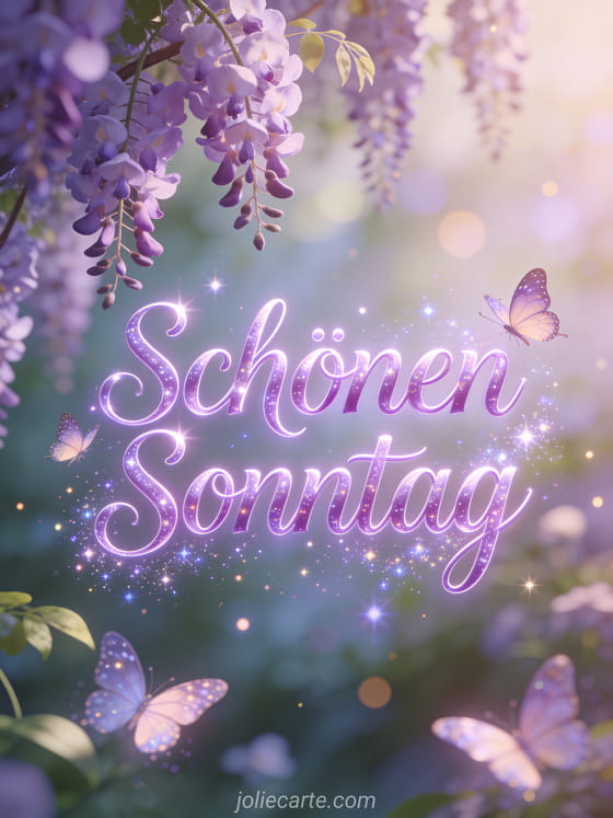 Senden Sie einen zauberhaften Sonntagsgruß mit tanzenden Schmetterlingen um Glyzinienblüten in einem verwunschenen Garten. Eine märchenhafte Art, jemandem einen wunderschönen Sonntag zu wünschen. Entdecken Sie auch eine sonnige Sonntag-Karte oder eine zärtliche Sonntag-Karte.