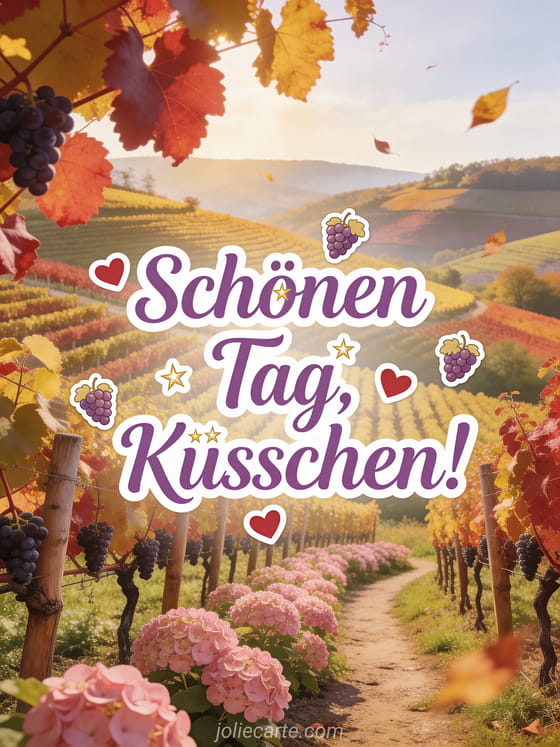 Erhellen Sie den Tag mit dieser herzlichen Karte mit geschwungenen Weinbergen im Herbst, roten und goldenen Weinblättern, rosa Hortensien und goldenem Herbstlicht. Entdecken Sie auch eine Guten-Morgen-Grußkarte oder eine Guten-Morgen-Karte mit Sonne.