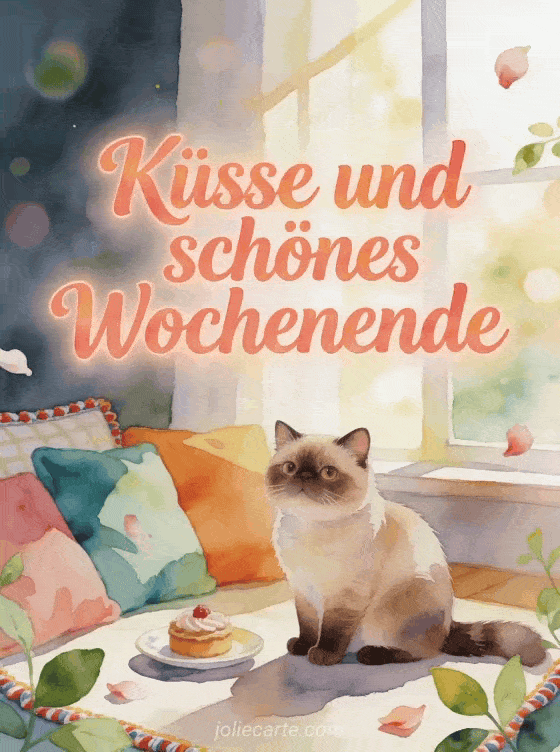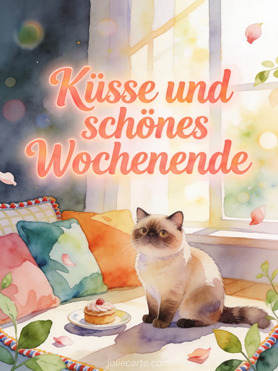 Sende eine gemütliche Wochenendkarte mit fröhlichem Aquarellschriftzug, einer Exotic-Shorthair-Katze, bunten Kissen und einem kleinen Teller mit Gebäck. Entdecke auch eine schönes Wochenende Küsschen GIF, eine schönes wochenende mit humor wünschen oder eine humor schönes wochenende foto.