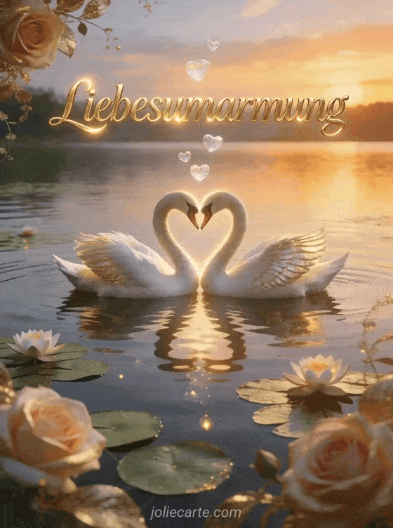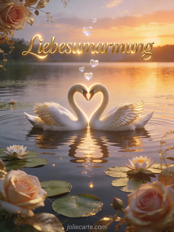Versende diese majestätische Liebesumarmung-Karte mit zwei Schwänen die mit ihren Hälsen ein Herz auf einem ruhigen See bei Sonnenuntergang bilden mit rosa und goldenen Spiegelungen im Wasser und durchscheinenden Herzen die über blühenden Seerosen schweben. Eine romantische Art deine Liebe auszudrücken. Entdecke auch eine Karte mit großer Liebesumarmung oder eine Trostumarmung-Karte.