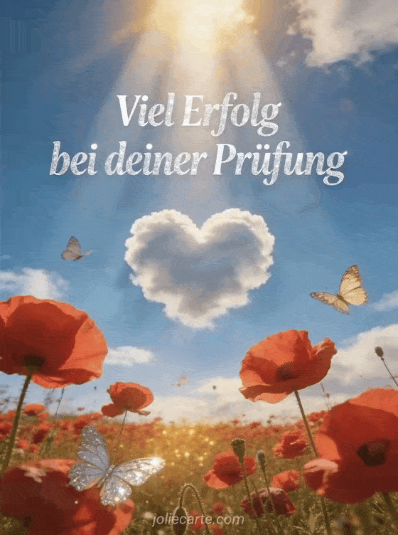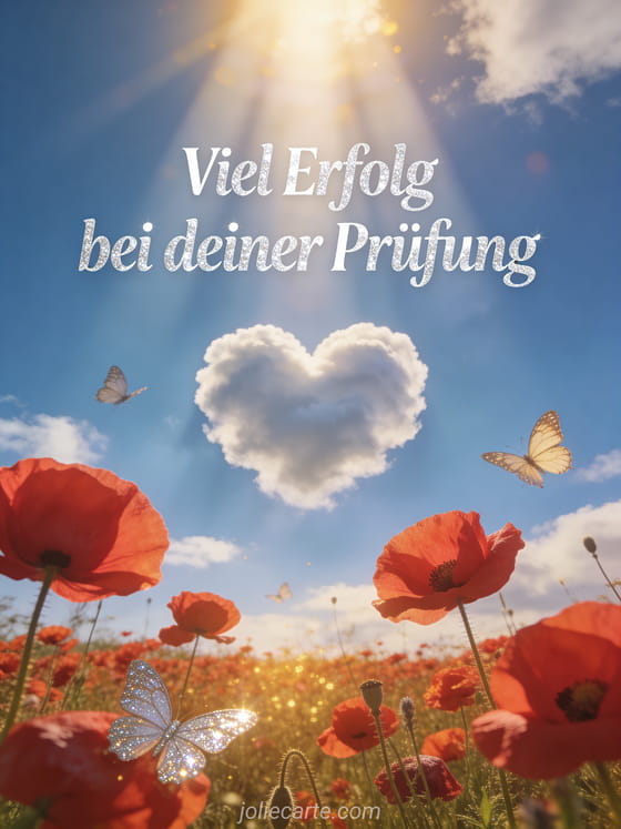 Senden Sie eine warme und aufmunternde Nachricht an jemanden, der sich auf eine Prüfung vorbereitet, mit dieser schönen Karte mit blauem Himmel, herzförmigen Wolken und einem Feld roter Mohnblumen.