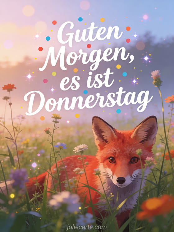 Begeistere jemanden mit diesem charmanten Fuchs-auf-der-Wiese-Donnerstaggruß. Entdecke auch eine schöne Karte schöner Donnerstag oder eine Karte guten Donnerstag Freunde.