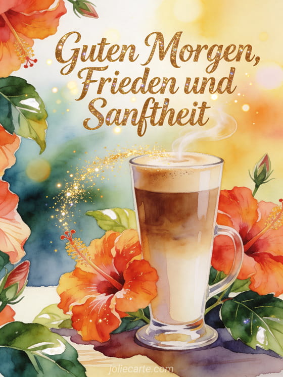 Teile einen hellen tropischen Morgen mit dieser Aquarellkarte, mit einem hohen Latte-Glas, kräftigen Hibiskusblüten, glänzenden Blättern und goldenen Funken um den Kaffeedampf. Entdecke auch Kaffee Guten Morgen mein Schatz, kostenloses Guten Morgen Kaffee Bild oder Morgenkaffee Guten Morgen.