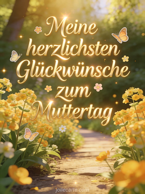 Teilen Sie Ihre herzlichsten Glückwünsche zum Muttertag mit dieser wunderschönen Karte mit eleganter Goldschrift und einem ruhigen Gartenpfad voller Taglilien. Entdecken Sie auch eine Muttertagskarte Blumen oder eine originelle Muttertagskarte.