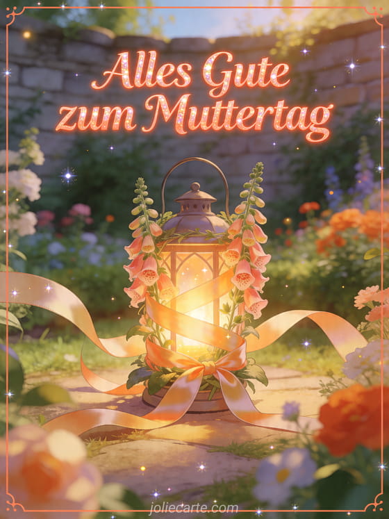 Teile eine Grußkarte Muttertag mit einer leuchtenden Laterne, Fingerhut und Satinbändern in einem strahlenden ummauerten Garten voller funkelnder Details. Entdecke auch Alles Gute zum Muttertag Supermama, einen Brief zum Muttertag oder Muttertagsworte.