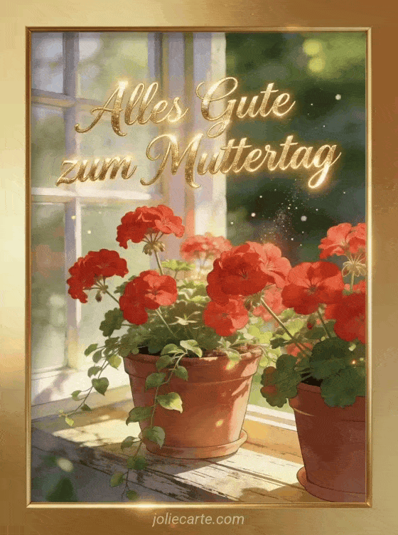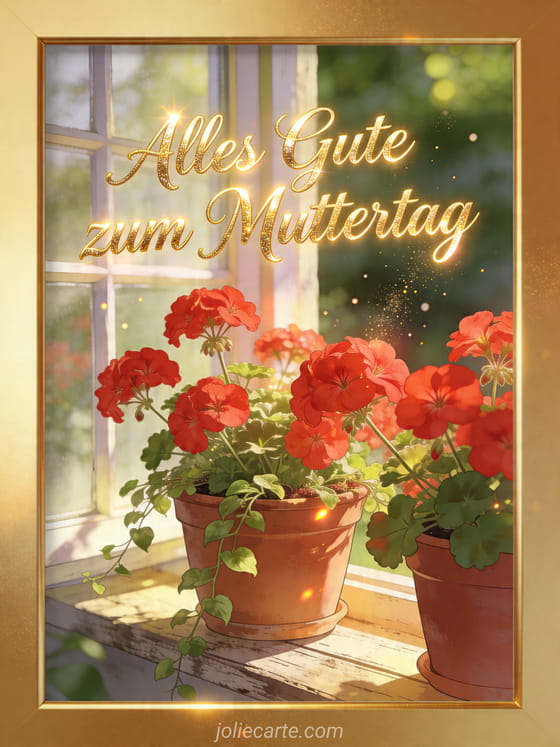 Teile eine einladende Muttertagskarte mit champagnerfarbener Schrift, einem fotorealistischen Fenstergarten, Terrakottatöpfen voller Geranien und warmem Sonnenlicht. Entdecke auch Alles Gute zum Muttertag für eine werdende Mama, ein Muttertagsfoto oder eine Zeichnung zum Muttertag.