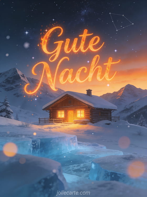 Sende ein gemütliches Gute-Nacht-GIF für deine Liebe mit dieser wunderschönen kostenlosen Karte. Eine gemütliche Hütte mit leuchtenden Lichtern in verschneiten Bergen unter einem winterlichen Sternenhimmel, für eine friedliche und romantische Gutenacht. Entdecke auch eine Karte Gute Nacht mein Schatz Liebesbotschaft oder eine Karte Gute Nacht der Liebe wünschen Bild.