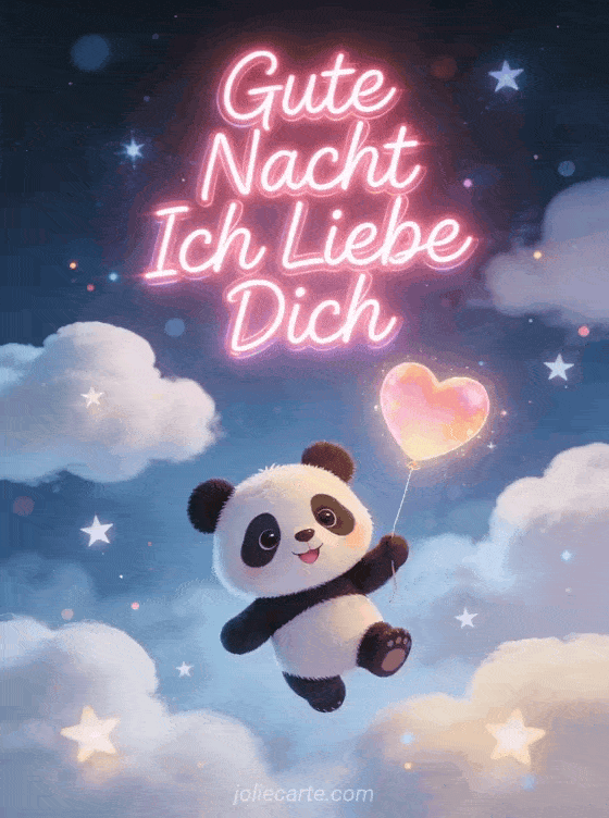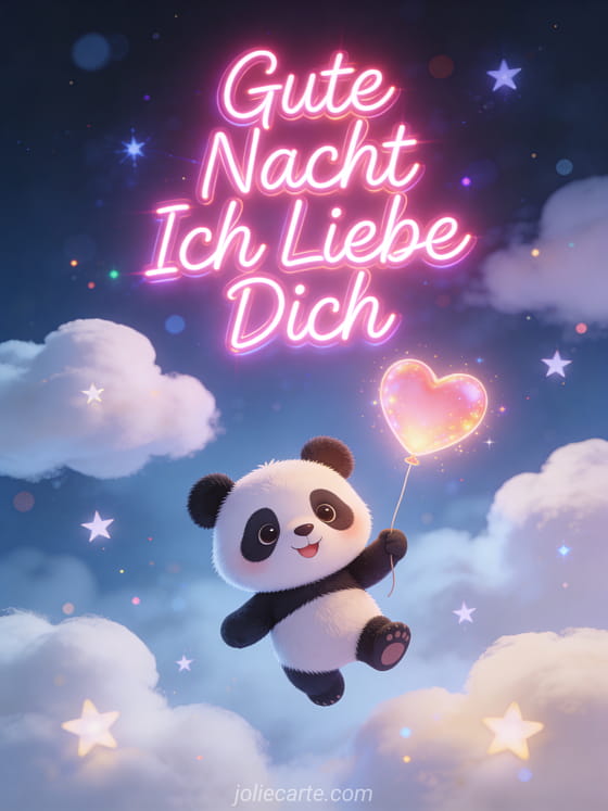 Sage gute Nacht mit dieser entzückenden Karte mit einem süßen Cartoon-Panda der einen leuchtenden Herzballon hält und zwischen Wolken und Sternen schwebt. Entdecke auch eine romantische Gute Nacht Karte oder eine Gute Nacht Mein Schatz Karte.
