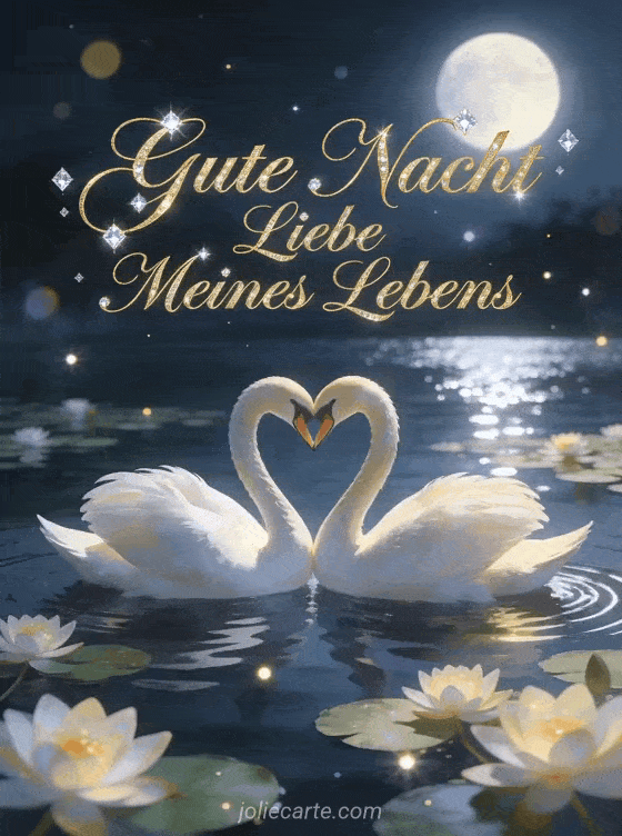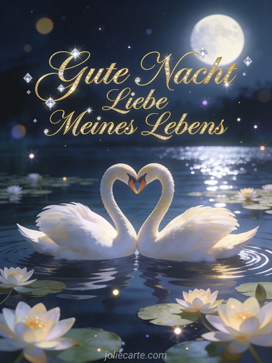 Sende einen majestätischen Gutenachtwunsch an die Liebe deines Lebens mit dieser wunderschönen kostenlosen Karte. Ein elegantes Schwanenpaar, das mit seinen Hälsen ein Herz auf einem mondbeleuchteten See mit Seerosen formt, für eine wirklich romantische Gutenacht. Entdecke auch eine Karte Gute Nacht mein Schatz SMS oder eine Karte Gute Nacht mein Liebling ich liebe dich.