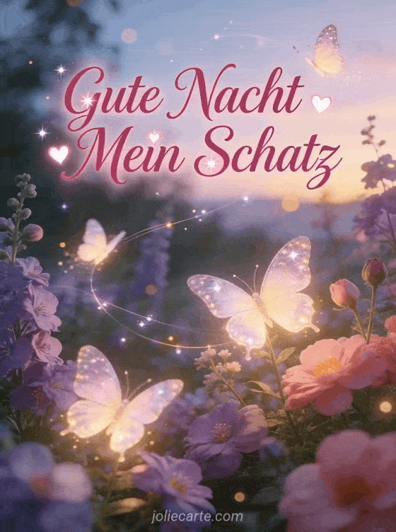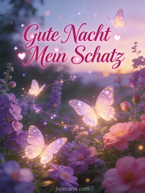 Sende eine magische Liebesbotschaft für die Gutenacht an deinen Schatz mit dieser wunderschönen kostenlosen Karte. Ein wunderschöner Schmetterlingsgarten in der Abenddämmerung mit lila und rosa Blumen und leuchtenden Schmetterlingen, für eine märchenhafte romantische Gutenacht. Entdecke auch eine Karte Gute Nacht der Liebe wünschen Bild oder eine Karte Gute Nacht Liebes Nachricht Bild.