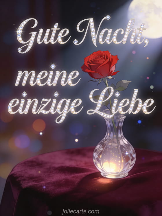 Sende einen wunderschönen Gutenachtwunsch an deine einzige Liebe mit dieser eleganten kostenlosen Karte. Eine perfekte rote Rose in einer Kristallvase im sanften Mondlicht, für eine romantische und exklusive Gutenacht. Entdecke auch eine Karte romantische Gute Nacht mein Schatz oder eine Karte ich liebe dich gute nacht mein schatz.
