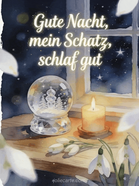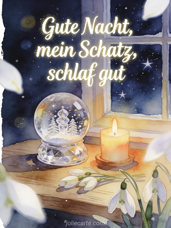 Teile eine liebevolle Gute-Nacht-Nachricht mit einer Kristall-Schneekugel, einer warmen Kerze, einem Sternenfenster und Schneeglöckchen. Entdecke auch eine gute Nacht virtuelle Karte, eine süße Gute Nacht Nachricht oder Karten schönen Abend und gute Nacht.