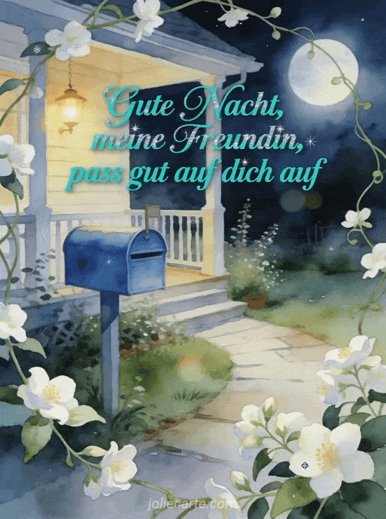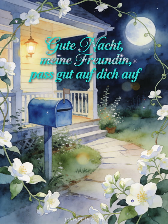 Sende eine sanfte Gute-Nacht-Nachricht an eine Freundin mit einem blauen Briefkasten, einem mondbeschienenen Gartenweg, warmem Verandalicht und Jasminblüten. Entdecke auch eine kleine Gute-Nacht-Nachricht, romantische Gute-Nacht-Nachricht oder Nachricht um einer Freundin Gute Nacht zu wünschen.