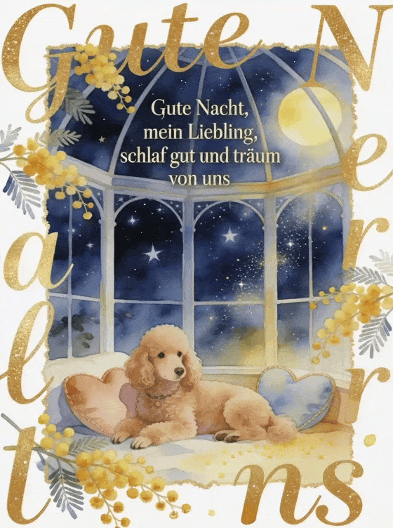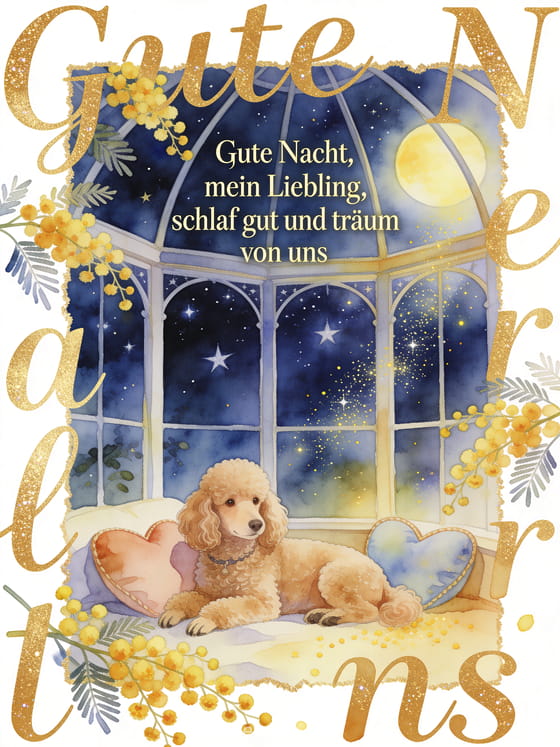 Sende eine gute-nacht-nachricht für ihren mann mit goldener Aquarellschrift, einem Pudel neben herzförmigen Kissen und Mimosen in einem sternhellen Wintergarten. Dazu passen auch diese sanfte Gute-Nacht-Nachricht, diese Gute-Nacht-Nachricht für seine Freundin oder diese hübsche Gute-Nacht-Nachricht.