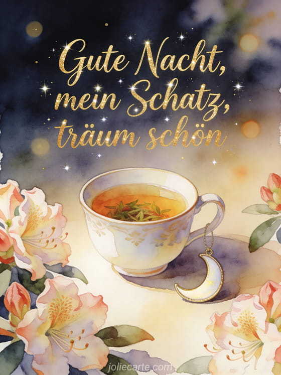 Teile eine warme Gute-Nacht-Nachricht für deinen Schatz mit einer Porzellantasse Kräutertee, einem Mondsichel-Ornament und Rhododendronblüten in Aquarell. Entdecke auch Gute Nacht Wunsch Nachricht, guten Abend gute Nacht Karte oder Gute Nacht E-Karte.