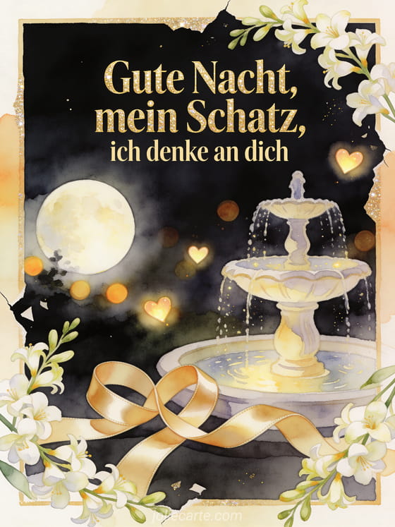 Teile eine romantische Gute-Nacht-Karte mit ineinandergelegten Satinschleifen neben einem Brunnen im Mondlicht, schwebenden Herzlichtern und Freesien. Entdecke auch eine schöne Nachricht zum Gute Nacht wünschen, eine Nachricht um seiner Frau gute Nacht zu wünschen oder eine Nachricht um seiner Freundin gute Nacht zu wünschen.