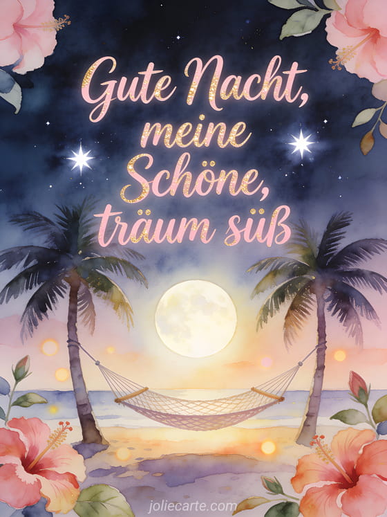 Teile eine sanfte tropische Aquarellnacht mit einer Hängematte im Mondlicht zwischen Palmen, hellen Sternen, Hibiskusblüten und warmer Inselstimmung. Entdecke auch hübsche Gute-Nacht-Nachricht, Gute-Nacht-Nachricht für sie oder Nachricht um deinem Schatz gute Nacht zu sagen.