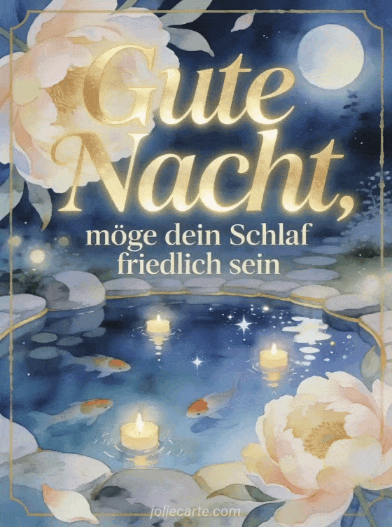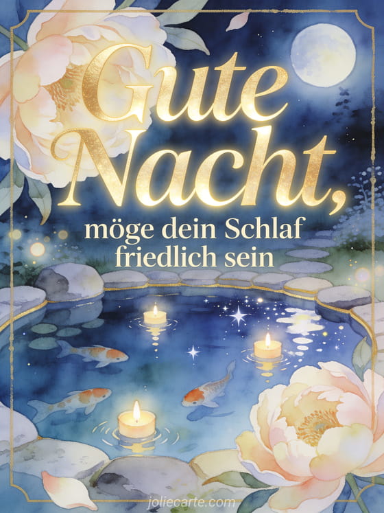 Sende eine ruhige Gute-Nacht-Nachricht mit blassgoldener Schrift, Pfingstrosenblättern, einem mondbeschienenen Koiteich, schwimmenden Kerzen und Sternreflexen. Entdecke auch eine guten Abend gute Nacht Karte, eine Gute Nacht E-Karte oder eine virtuelle Karte schönen Abend gute Nacht.