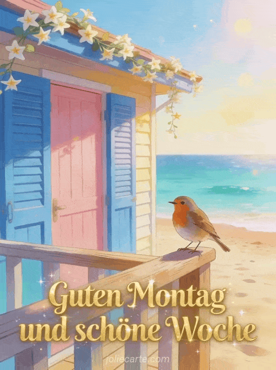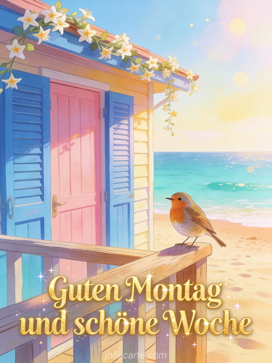 Starten Sie die Woche mit guter Laune und versenden Sie diese schöne Montag-Grußkarte. Eine bunte Strandhütte, ein freundliches Rotkehlchen und duftender Jasmin unter der Sommersonne. Entdecken Sie auch eine lustige Montag-Karte oder eine Montag-Karte mit Küssen.