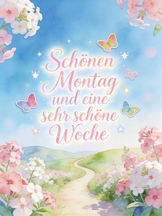 Sende schönen Montag und eine sehr schöne Woche mit bunten Schmetterlingen, funkelnden Sternen und einem gewundenen Weg durch blühenden Phlox unter frischem blauem Himmel. Entdecke auch Bilder um einen schönen Montag zu wünschen, schönen Montag und gute Woche Zitat GIF oder Schönen Montag Landschaft GIF.
