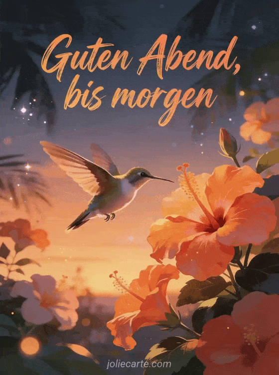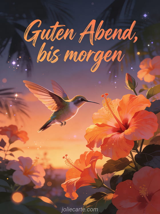Teile eine schöne Guten Abend bis morgen Karte mit einem Kolibri bei tropischen Hibiskusblüten in der Abenddämmerung. Entdecke auch ein gute Nacht bis morgen Küsschen Gif, eine Guten Abend gute Nacht bis morgen Karte oder ein Bild gute Nacht Küsschen bis morgen.