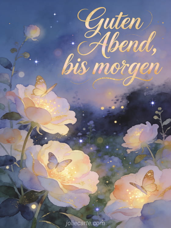Teile poetische Abendbilder mit diesem Garten in der Dämmerung mit Schmetterlingen. Entdecke auch eine Gute Nacht bis morgen lustig Karte oder eine Guten Abend bis morgen lustig Karte oder eine Guten Abend bis morgen Bild Karte.