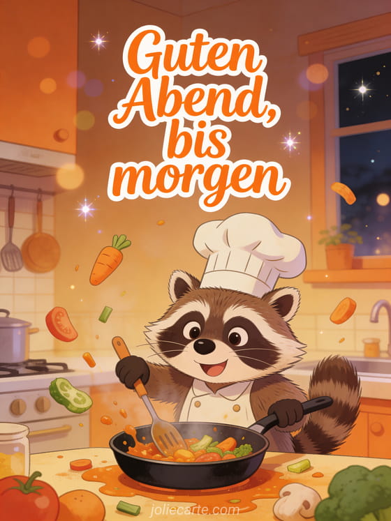 Bring jemanden zum Lachen mit dieser witzigen Guten-Abend-Karte mit Waschbären-Koch. Entdecke auch eine Guten Abend bis morgen Bild Karte oder eine gute nacht bis morgen küsschen gif Karte oder eine guten abend gute nacht bis morgen Karte.