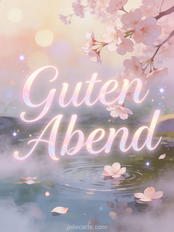 Schicke einen sanften Guten-Abend-Gruß mit dieser schönen kostenlosen Karte mit Kirschblüten und einem ruhigen Teich. Entdecke auch einen Guten Abend funkelnder Gif oder einen kleiner Guten-Abend-Gruß.