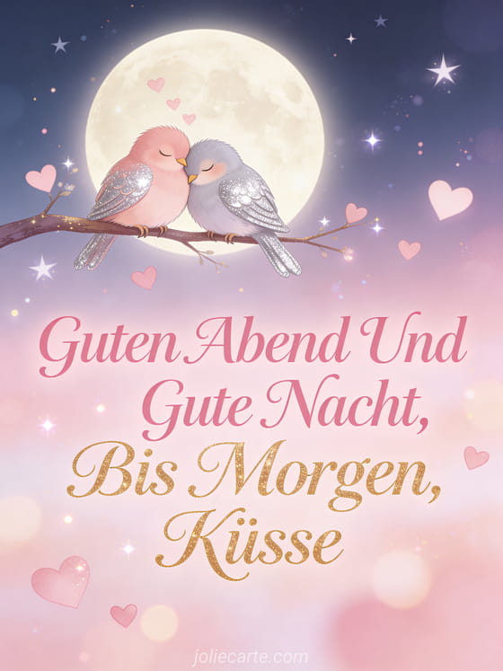 Schicke einen romantischen Abend- und Nachtgruß mit dieser kostenlosen Karte. Entdecke auch eine Karte bis morgen guten Abend Küsse oder eine Karte guten Abend bis morgen Küsse.