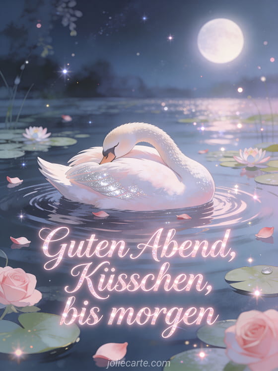 Teile einen zärtlichen Abend mit Küsschen mit dieser romantischen Mondschein-Schwan-Karte. Entdecke auch eine Guten Abend und bis morgen Bild Karte oder eine Guten Abend bis morgen Bilder Karte oder eine Gute Nacht bis morgen lustig Karte.