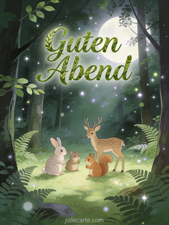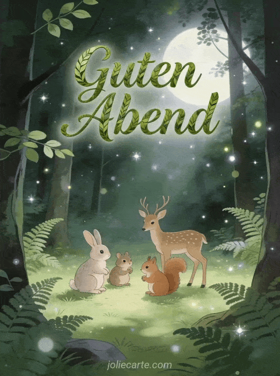Teile diese bezaubernde Guten-Abend-Karte mit Waldtieren. Entdecke auch Schönen Abend einer Freundin wünschen oder GIF Schönen Abend zen.