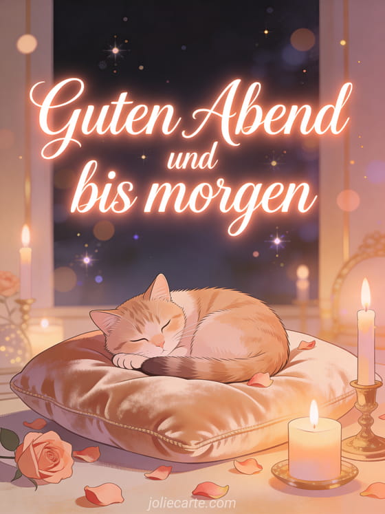 Teile ein schönes Guten Abend und bis morgen Bild mit einer friedlich schlafenden Katze auf einem Samtkissen, umgeben von sanftem Kerzenschein und verstreuten Rosenblättern. Entdecke auch ein Guten Abend bis morgen Bilder, eine Gute Nacht bis morgen lustig Karte oder eine Guten Abend bis morgen lustig Karte.