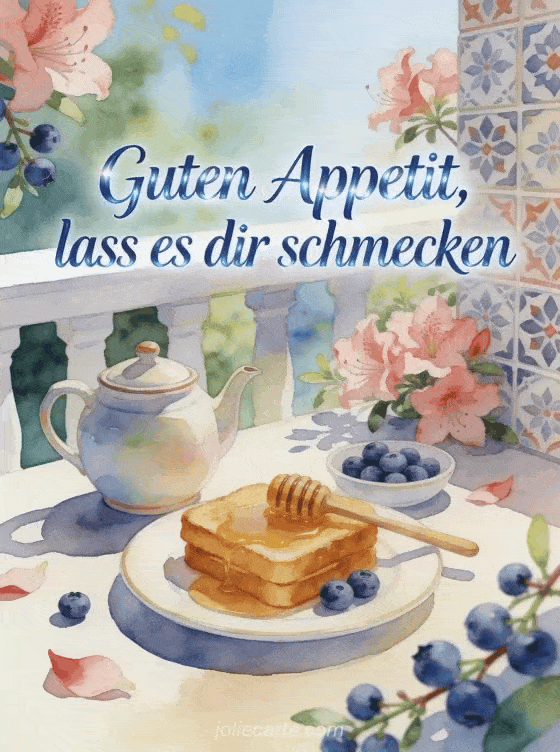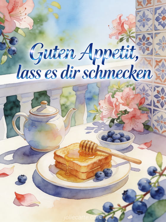 Teile einen fröhlichen Guten-Appetit-Gruß mit einer Keramik-Teekanne, Honigtoast, Blaubeeren, Azaleenblüten und gemusterten Terrassenfliesen in Aquarell. Entdecke auch Bild mit geschriebenem Guten Appetit, Guten Appetit Text oder Guten Appetit mein Schatz Bild.