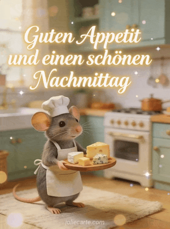 Teile einen Guten-Appetit-Nachmittagswunsch mit dieser entzückenden Maus-Koch-Karte. Entdecke auch Guten Nachmittag animierte Bilder oder animiertes Guten Nachmittag GIF.