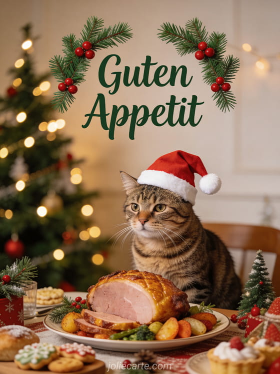 Sende diesen gemütlichen Weihnachts-Guten-Appetit mit einer realistischen Tigerkatze mit Weihnachtsmütze neben einem Festessen mit Schinken und Stechpalmen-Dekorationen. Entdecke auch eine Karte Guten Appetit GIF Bild oder eine Karte Guten Appetit Karte Bild.