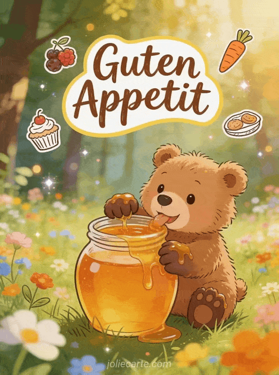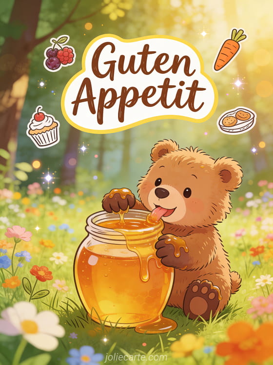 Sende diese bezaubernde Guten-Appetit-Zeichnung mit einem Cartoon-Bärenjungen das Honig aus einem großen Topf auf einer sonnigen Wiese leckt. Entdecke auch eine Karte Guten Appetit Bild oder eine Karte lustiges guten appetit.