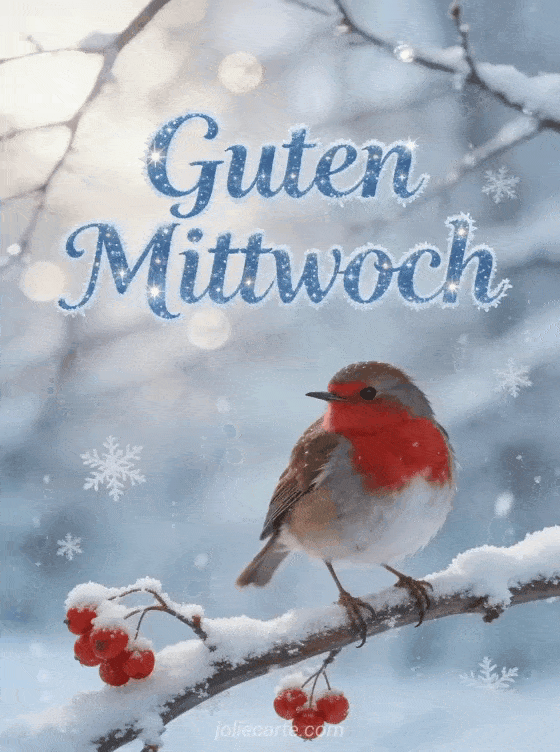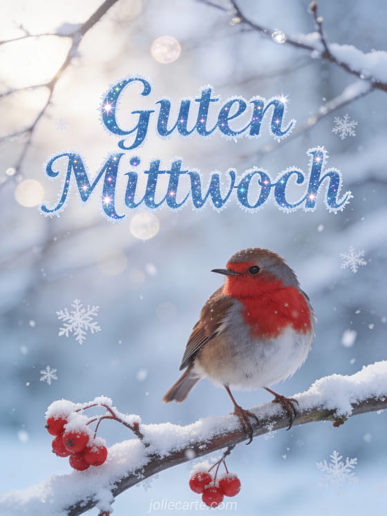 Teile einen stillen Mittwochswintergruß mit dieser friedlichen Karte mit einem bezaubernden Rotkehlchen auf einem verschneiten Ast mit roten Beeren. Entdecke auch schönen mittwoch oder sms guten mittwoch schreiben für mehr Mittwochsinspiration.