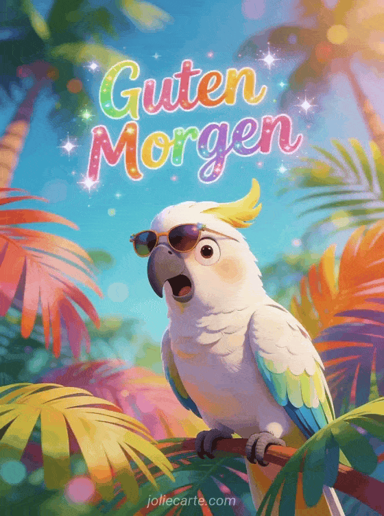 Teile einen lustigen Guten-Morgen-Gruß mit verspielter bunter Schrift, Funkeln und einem lustigen Kakadu-Papagei mit überraschter Miene, der eine winzige Sonnenbrille zwischen tropischen Palmenblättern trägt. Entdecke auch eine Guten-Morgen-Freitag-Landschaftskarte, Bilder zum schönen Freitag oder eine Humorkarte zum schönen Freitag und Wochenende.