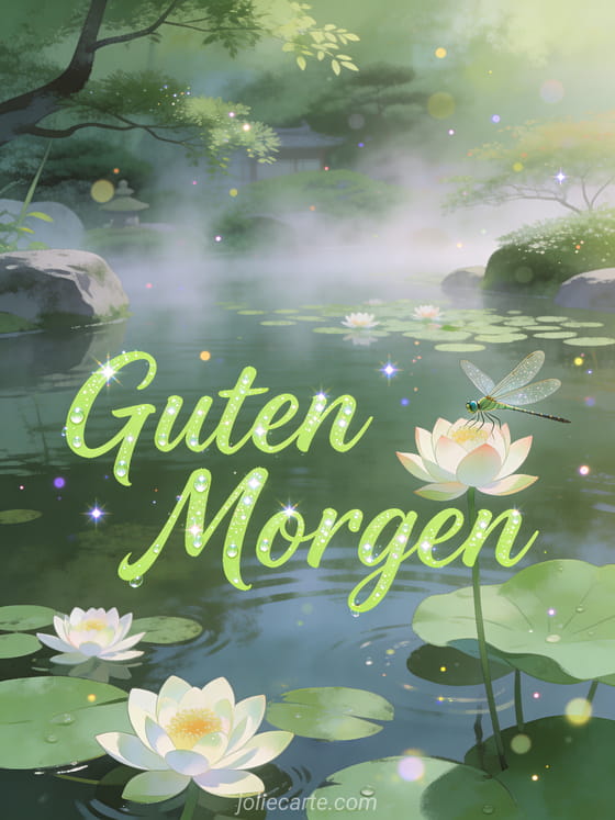 Teile schöne Guten Morgen Bilder mit einer zarten Libelle auf einer Lotusblume in einem friedlichen Teich mit Seerosen und Morgennebel in einer ruhigen japanischen Gartenatmosphäre. Entdecke auch ein Guten Morgen Zitat, eine Guten Morgen SMS Karte oder eine Guten Morgen Nachricht Karte.