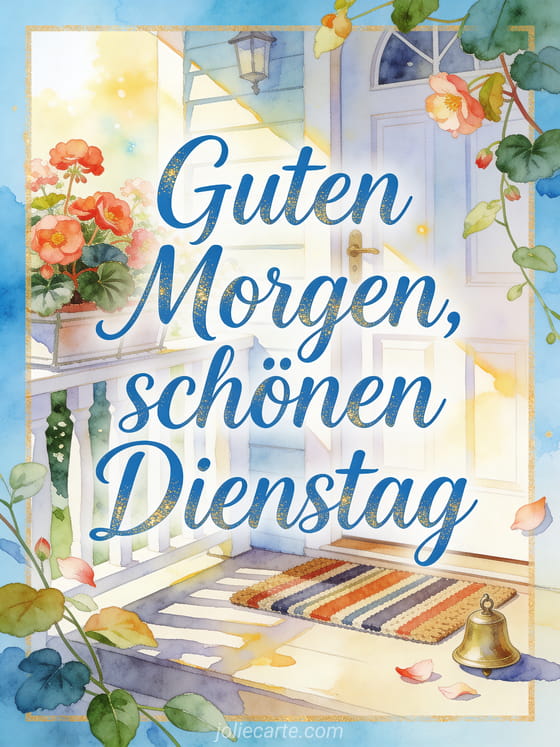 Sende einen einladenden Guten-Morgen-Gruß zum Dienstag mit einer hellen Veranda, Begonien, einer gestreiften Fußmatte und einer kleinen Messingglocke. Entdecke auch Schönen Dienstag meine Freundin Bild, schönen Dienstag animiertes Bild oder animierte Schönen-Dienstag-Küsschen-Bilder.